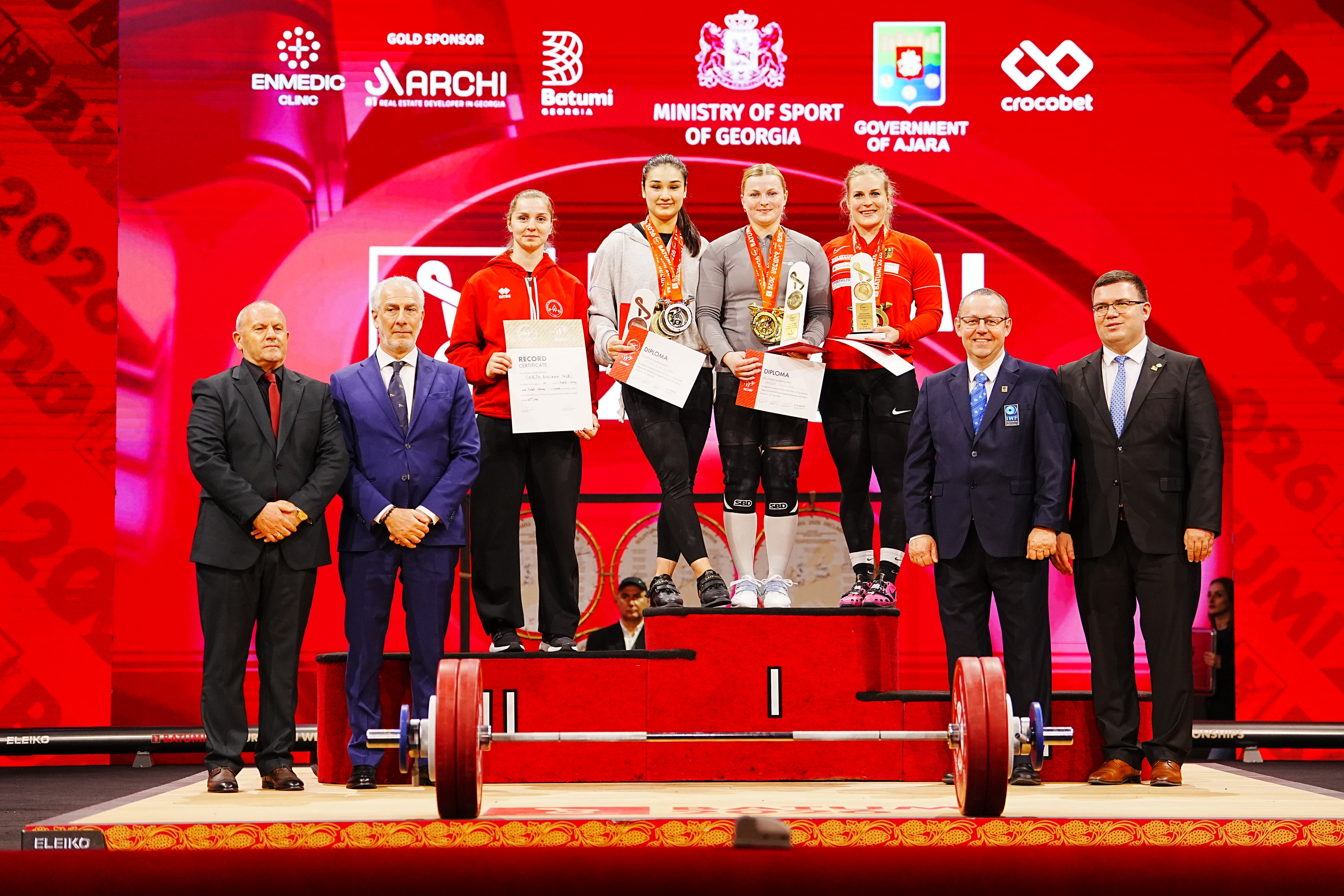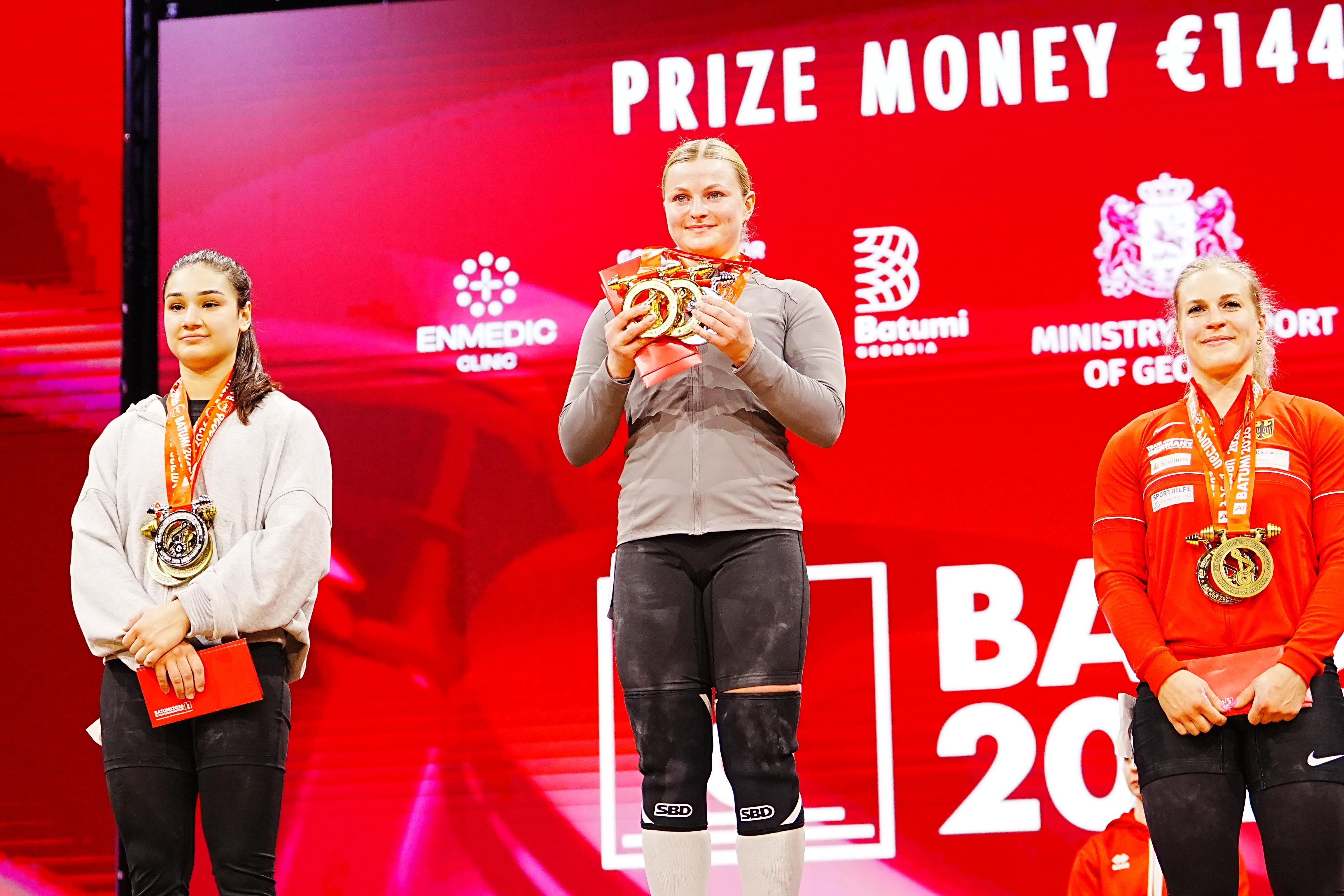 ბათუმის სპორტის სასახლეში, სადაც ძალოსნობაში ევროპის ჩემპიონატს მასპინძლობენ, ქალთა შორის 69 კილოგრამ წონით კატეგორიაში გათამაშდა მედლები.