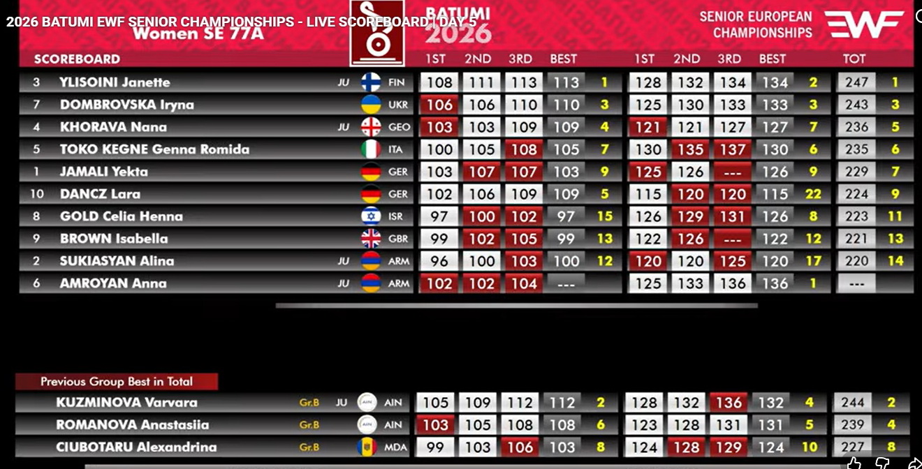 ევროპის ჩემპიონატის მეხუთე საშეჯიბრო დღის ბოლოს მედლები გათამაშდა ქალთა 77 კილოგრამ წონით კატეგორიაში, სადაც საქართველო წარმოდგენილი იყო ნანა ხორავათი.